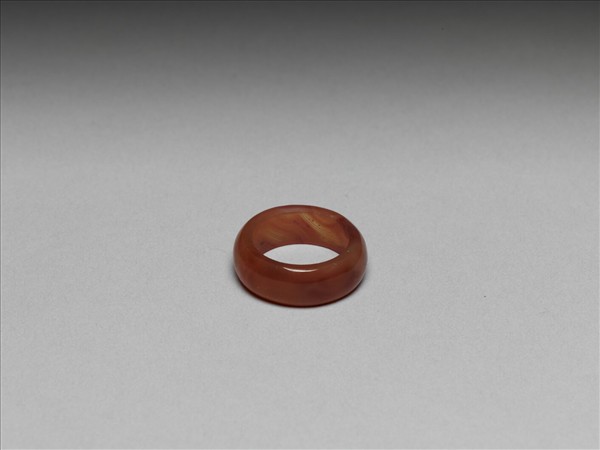 環形戒,由赭紅瑪瑙雕琢而成,素面,瑪瑙本質有天然斜紋與斑塊。