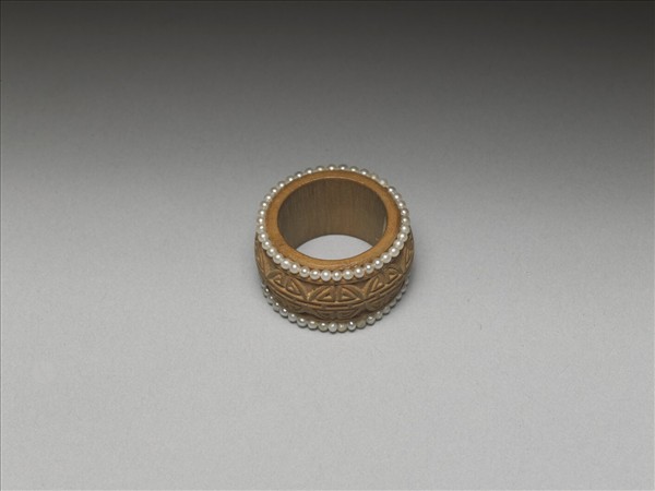 環形戒,以檀香木雕成,戒面浮雕團壽紋,戒緣上下各緝一圈米珠。