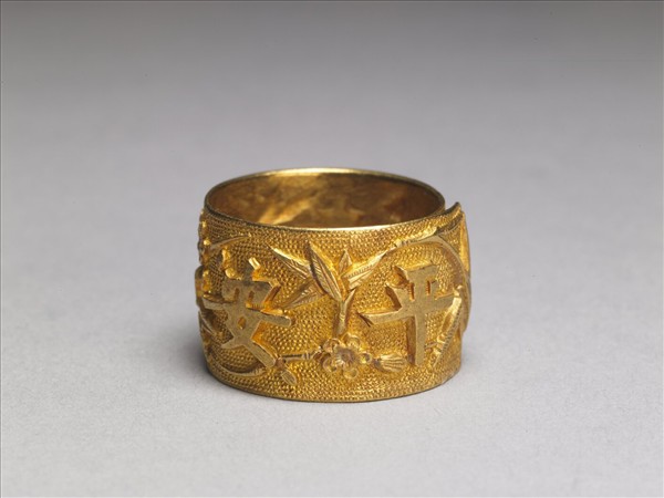 由金片捲成環狀,表面鐫「平安如意」四字,並飾梅枝與竹葉,淺粟米金珠為地紋。背銘「足金」、「廉陞」四字。