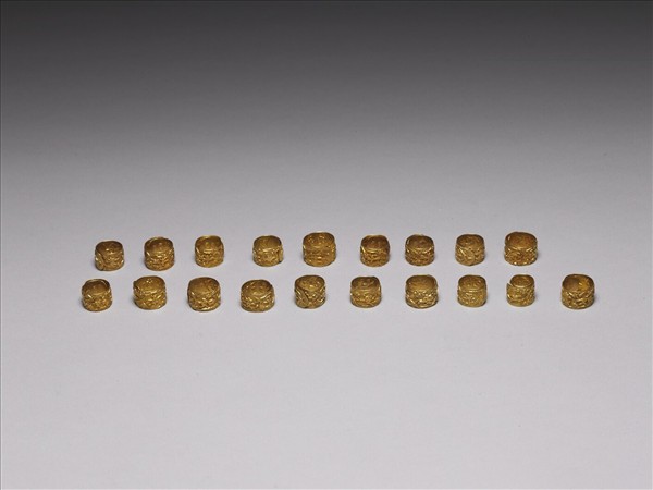 由金片捲成環狀,表面錘鍱出「平安如意」四字,字間飾梅枝與竹葉,鏨刻粟紋為地。背銘「足金」、「廉陞」四字。故雜8894~8912計十九件金戒指,共附兩張黃籤,分別書「六十五號」與「六十六號」。
