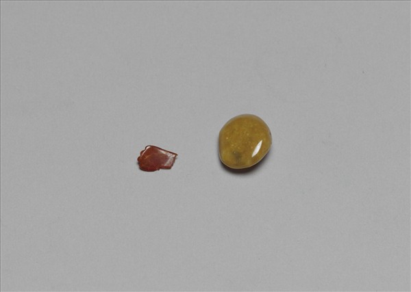大小兩件石膽。大者呈土黃色似鵝卵形,表面光滑無紋;小者為赭紅扁平狀,原有斷裂痕跡,亦無紋飾。