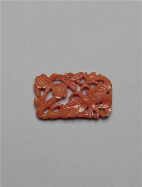 珊瑚挑牌,略呈長方形,對角處分別鏤雕蝴蝶與折枝梅花兩朵,餘飾草葉。
