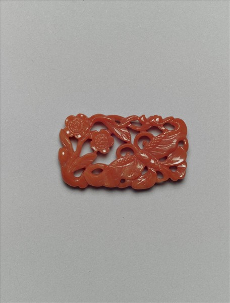 珊瑚挑牌,略呈長方形,對角處分別鏤雕蝴蝶與折枝梅花兩朵,餘飾草葉。