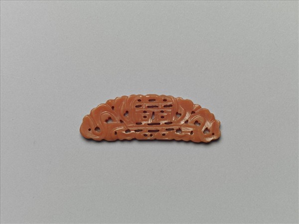 珊瑚腰結,略呈半橢圓形,中鏤雕囍字,周繞綬帶。