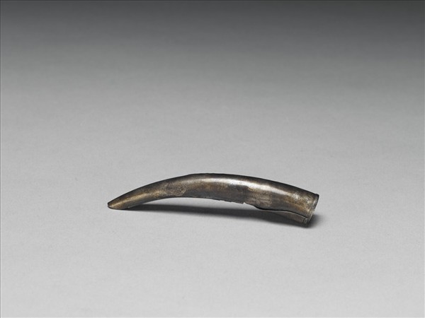 銀質弓形指甲套,自基底至指間漸細,套面光素平滑,背作空格式,套背指尖部分未封閉,以利通風,背基包合可伸縮。