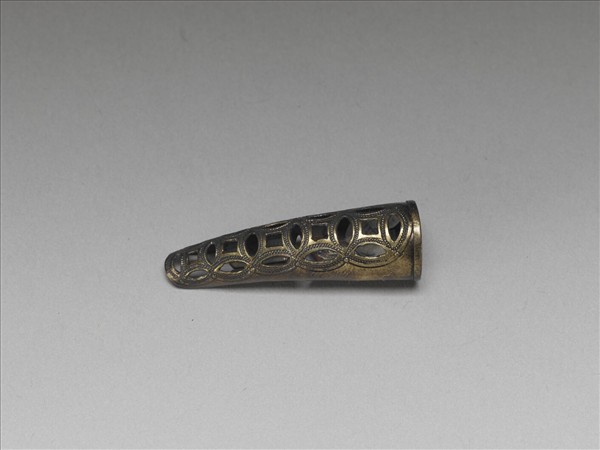 銀質弓形指甲套,基底至指尖鏤雕五個漸小相扣古錢紋,錢紋上鏨刻魚子紋,套背指尖部分未封閉,以利通風,背基包合可伸縮,本件鎏金有部分剝落的狀況。