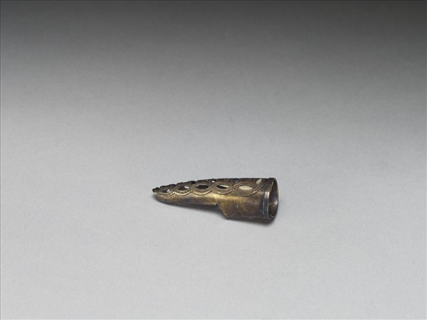 銀質弓形指甲套,基底至指尖鏤雕五個漸小相扣古錢紋,錢紋上鏨刻魚子紋,套背指尖部分未封閉,以利通風,背基包合可伸縮,本件鎏金有部分剝落的狀況。