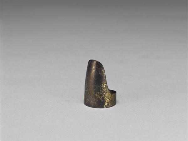 銀鎏金指甲套,基部為一固定圓環,上附指甲形的葉片,素面無紋,面部鎏金脫落嚴重。其葉片的長度,僅能蓋過指尖少許,故可能為撥琴用的指套,尚待進一步考證。