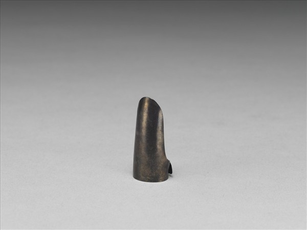 銀鎏金指甲套,上附指甲形葉片,全器素面無紋,鎏金脫落,背基包合可伸縮。