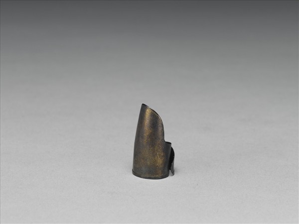 銀鎏金指甲套,上附指甲形葉片,全器素面無紋,鎏金脫落,背基包合可伸縮。