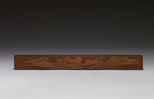 全器採用紫檀硬木為主體,上面又嵌入一段長竹片,竹片以留青陽文技法淺浮雕山水樓閣,好似一幅清初四王風格的山水畫。一般而言,製作竹刻品都需刮削去青筠,但是雕製「留青陽文」作品時,不可刮剝青筠,而是直接在青筠上雕刻,依著紋飾的變化,或者留下青筠,或者刮削掉青筠,藉著青筠的多留、少留或不留,產生紋飾的層次與明晦。此時,青筠為紋飾,竹肉為地子;竹筠潔如玉,竹肉有絲紋。青色的竹筠年久呈淺黃色,牙白色的竹肉則年代越久顏色越深,最後可呈褐黃色。「留青陽文」就藉著青筠與竹肉的不同色澤,清晰地顯露出紋飾,而且年份越久,色澤相差越大,紋飾越清晰。其實這也是淺浮雕技法的運用。
