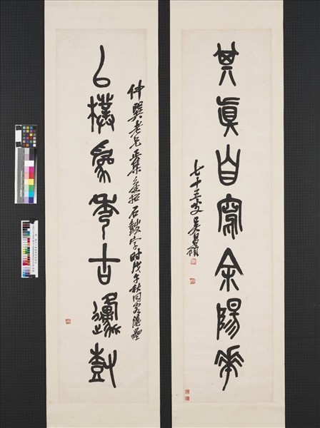 〈石鼓文〉為春秋戰國時代遺物,發現於陜西鳳翔,刻於十個鼓形石上,記述秦君田獵事。字形體勢雖屬大篆一系,但已透露與秦代小篆的關連。吳昌碩(一八四四-一九二七)原名俊,號缶廬、苦鐵等,為晚清書畫、篆刻名家,浙江安吉人。其篆書用功以〈石鼓文〉為最,晚年入古出新,開拓新風貌。此聯從石鼓文集字而成「以樸為秀古原樹。其真自寫余陽花」,筆力蒼勁,饒有古風。 (20120713)