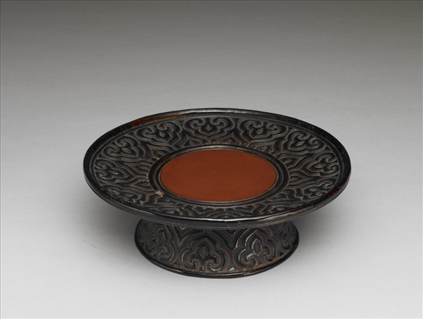 高足盞托,木胎。足徑寬廣,足沿微外張,盤面弧度微向上,造型輪廓線溫和敦厚。胎體輕薄,托面中央的紅褐漆和足內褐漆,可能為後髹,托緣內外及足外為雕漆,作黑漆剔犀如意雲紋。托面圓心外圍平均分佈十二朵如意雲紋,頂部呈尖形,內作桃形,樣式單純,佈局均衡清晰。地漆帶黃色調,以斜刀深刻,切面露出深褐色漆,上、下各一紅線,用刀沈穩,線條樸實內斂,全器呈現一種理性而單純的優雅美感,具有時代特色。剔犀為宋代雕漆的主流。