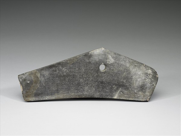 玉磬,深青灰色,樣式有如兩端被截切一段的磬,且兩端所截去的部份長短不一,若將繩繫於面上的穿,被懸掛的磬更會顯現其不對稱的姿態、美感。磬為樂器,通常多片一組,依其大小厚薄排列懸掛,便可順次敲打出不同音階的聲響,本院所藏為十件一組的編磬(購玉5-購玉14),此為其中之一。