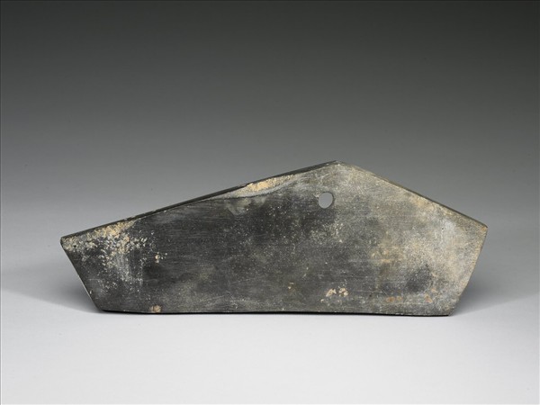 玉磬,深青灰色,樣式有如兩端被截切一段的磬,且兩端所截去的部份長短不一,若將繩繫於面上的穿,被懸掛的磬更會顯現其不對稱的姿態、美感。磬為樂器,通常多片一組,依其大小厚薄排列懸掛,便可順次敲打出不同音階的聲響,本院所藏為十件一組的編磬(購玉5-購玉14),此為其中之一。