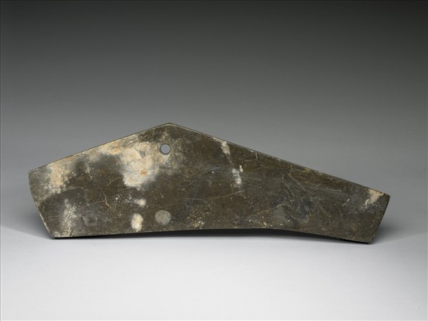 玉磬,深青灰色,樣式有如兩端被截切一段的磬,且兩端所截去的部份長短不一,若將繩繫於面上的穿,被懸掛的磬更會顯現其不對稱的姿態、美感。磬為樂器,通常多片一組,依其大小厚薄排列懸掛,便可順次敲打出不同音階的聲響,本院所藏為十件一組的編磬(購玉5-購玉14),此為其中之一。
