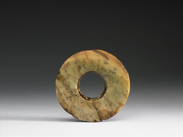 玉質,多細長裂痕,可能在明清時被染色,有濃淡不一的赭斑和墨斑,局部泛白色。器略厚,外緣有傷。