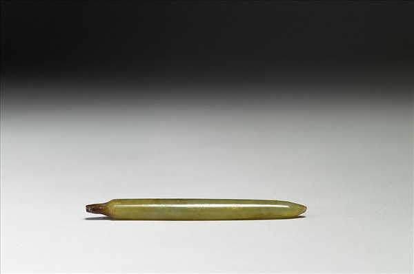 錐形器是良渚文化、大汶口文化裡常見的玉器,長短、圓方多變。基本形制為長條狀,一端收斂成尖端,另一端或縮扁、或琢成榫頭,多半鑽有小孔。學者認為它最初可能是刮砭人體穴道以治病的工具,逐漸發展成帶有通神意義的裝飾品。良渚文化早期流行剖面為圓形的光素錐形器,常多件尖端向上地出現於墓主頭頂,可能用小孔縫綴固定於冠帽上。