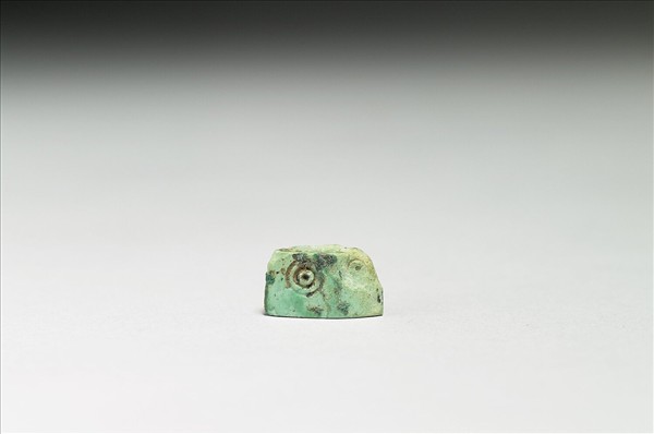 綠松石,因成分不同顏色不一,此器呈藍綠帶黃色。矮橢圓柱形,前後兩面各刻一對雙重圈,部分痕跡已淡。頂端中央鑽有一穿孔。此器可能作為墜飾之用。