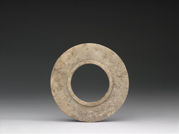 灰白色石英,有赭色及淡墨色斑紋,表面有許多附著物。中孔略大且歪斜,兩面沿著孔緣各作一圈突邊。