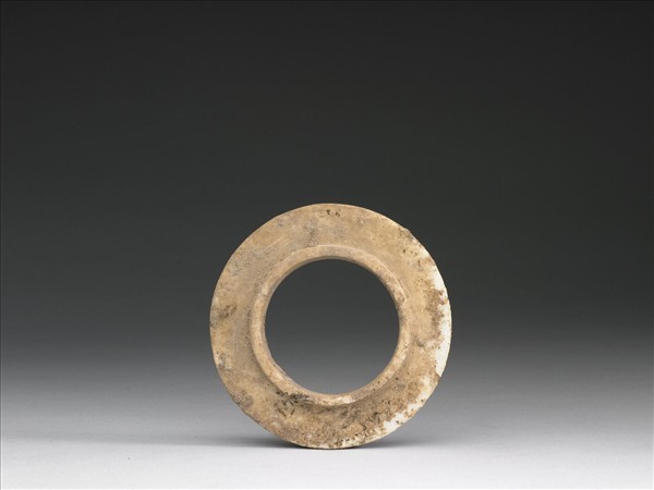 灰白色石英,有赭色及淡墨色斑紋,表面有許多附著物。中孔略大,兩面沿著孔緣各作一圈突邊。