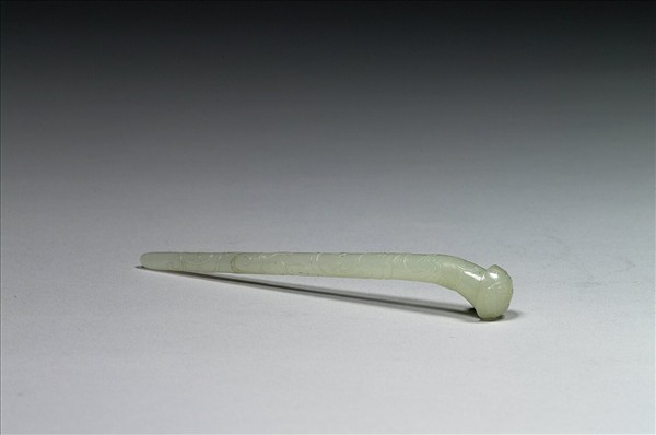 玉質,清亮光潤,作成髮簪。簪淺浮雕螭龍,簪身陰線刻篆書「子剛」二字。陸子剛是蘇州琢玉名家,十七世紀方志筆記中多提及,為中國少數留名的工匠之一。