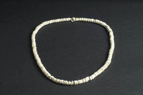 乳白色的扁圓形貝片,串聯成一條鍊子。附件有三個長短不一的玉管和三個碧綠色的玉璜。