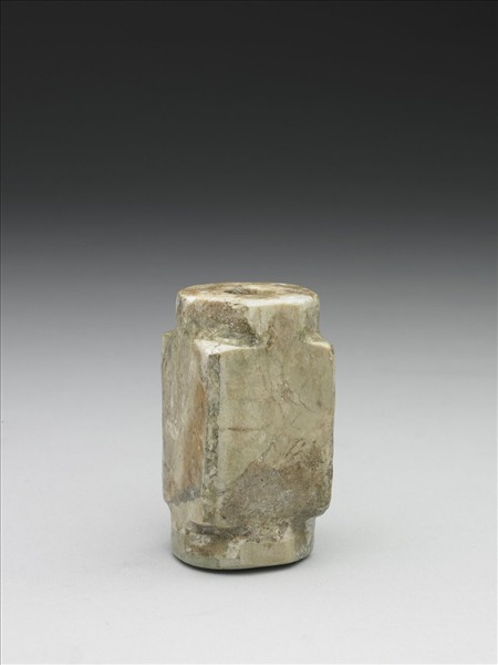 灰白色,夾雜赭色、綠色、白色斑紋。內圓外方,中央貫通。此器中孔小,器厚,直壁無紋。