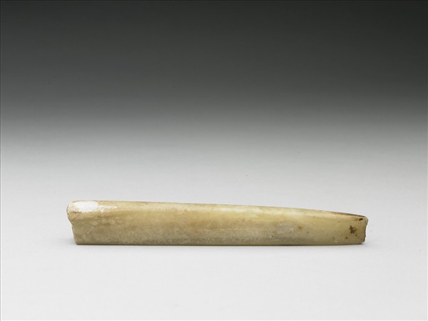 石質微透明,有灰黃條斑。全器作窄長梯形,橫截面作長方形,製作不規整。柄端較寬,兩面對磨出中鋒平直刃,刃線長僅1.2公分,已使用得甚為殘破,柄端無孔。