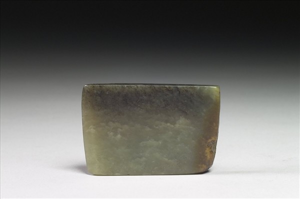 碧綠色閃玉,局部赭黃色。正面呈梯形,側面一面微帶淺弧形,偏鋒刃。