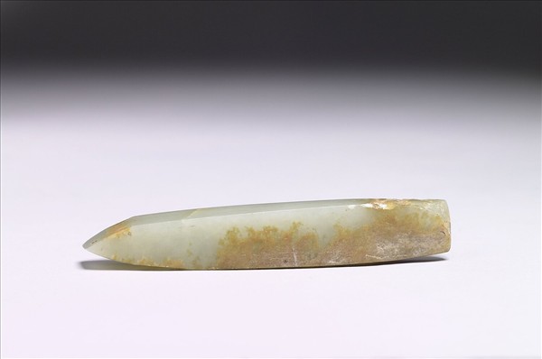 玉質,局部赭色斑。全器長條形,器略厚,刃部為偏鋒,柄端不平整。