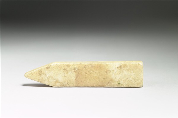 石質,泛淡黃赭斑。長條狀,一端作方形,一端作尖角。樸素無紋。