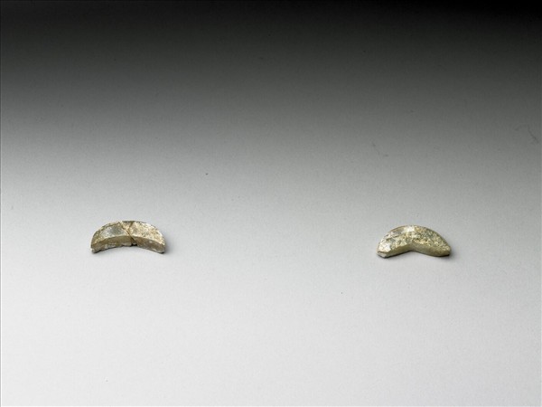 玉質,局部受沁白化,有裂璺。新月形狀玉片,覆蓋於死者眉毛的部份,為隨葬器。購玉74、75、463、464、81、82、78、79、462為玉覆面一組。