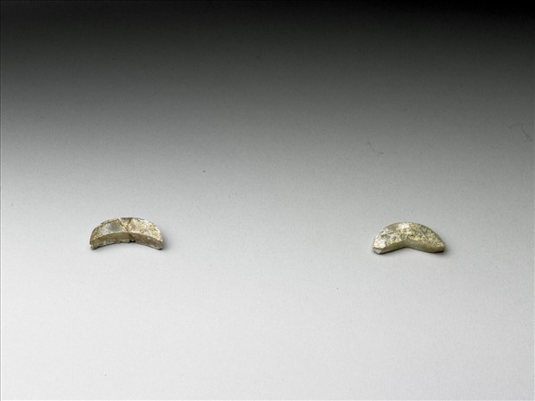 玉質,局部受沁白化。新月形狀玉片,覆蓋於死者眉毛的部份,為隨葬器。購玉74、75、463、464、81、82、78、79、462為玉塞一組。