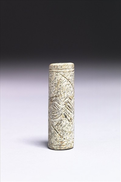 石質。曾測試比重2.55,硬度5。經拉曼光譜檢測為蛇紋石(Serpentine),淡黃綠色有白沁斑。琢作兩端甚歪斜的圓柱體。沿器表鑽鑿三組隧孔,可知此為縫綴於織物上的裝飾。器表兩端各刻二圈陰線,中段刻菱形格,格內以平行、輻射或交叉的短直線,及由連續短線構成的圓弧線,勾畫出一朵平展的花朵。線條粗放,頗相似於河姆渡文化或馬家浜文化陶器上刻畫的植物紋。