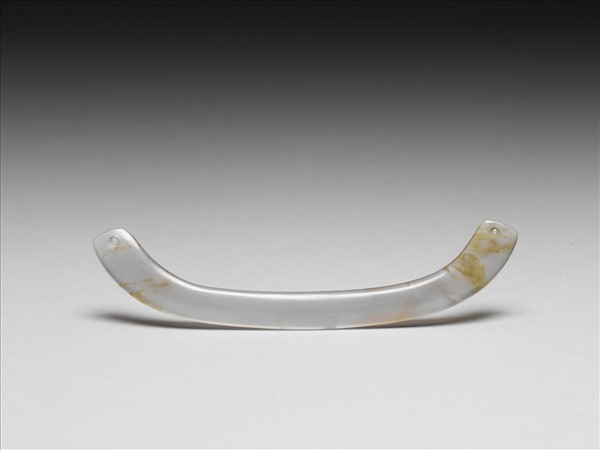 玉髓,是石英家族的潛晶質礦物,成分為二氧化矽。它既硬又脆,但不易受周邊雜質的沁染,即或長期埋在墓葬中,還可以保持光潔的表面。此件全器灰紫色,局部帶有黃褐色條斑,可稱為「瑪瑙 agate」。它的弧度已非一般的圓弧形,而是中段較平直,兩端彎折,常被稱為「橋形璜」。小孔兩面對鑽。