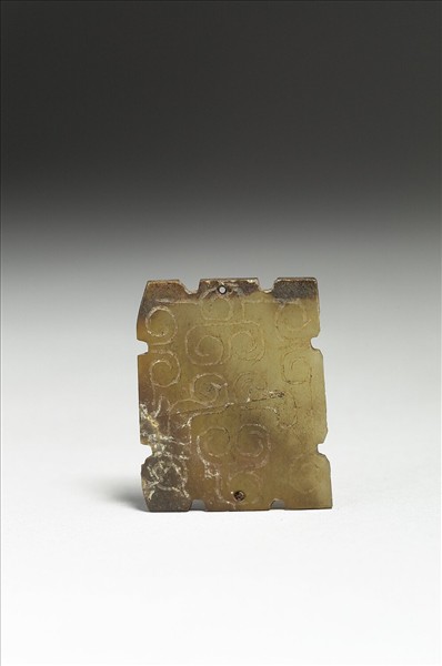 四方形玉片,部分為赭色,有白斑。每邊各有兩個小凹槽,單面遍佈陰線刻雲紋。上下中央各鑽一小孔。