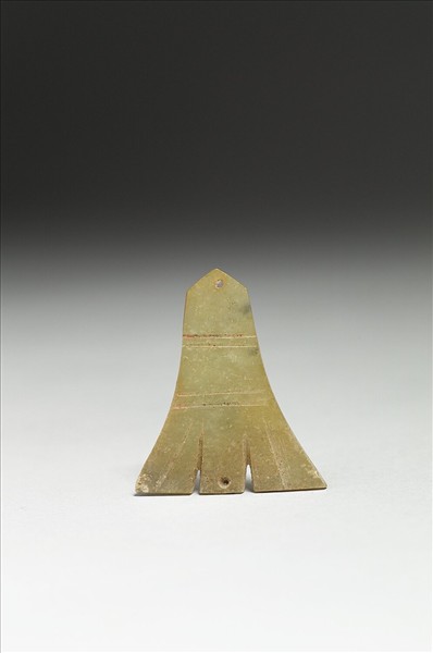 玉質,帶墨綠、白色斑,表面有附著物。似鐘形,上方作一尖角。單面陰線刻兩組橫線、兩組一長一短的直線,末端形成齒棱。上下各鑽一孔,用來穿繩繫掛。