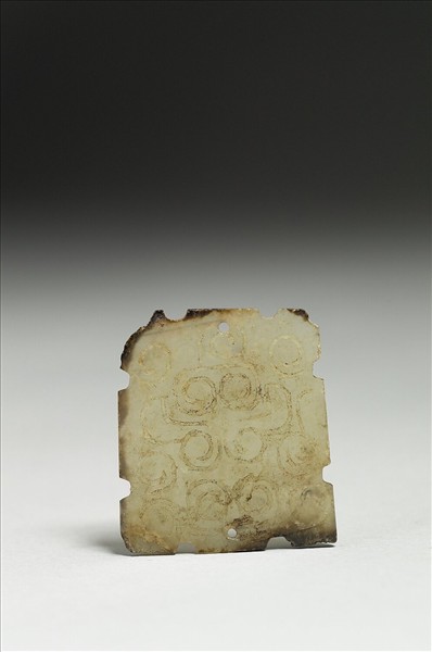 四方形玉片,部分邊緣為墨色。四個角都有傷缺,每邊各有兩個小凹槽,單面陰線刻雲紋,紋飾已淺。上下中央各鑽一小孔。