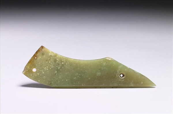 玉質,有白色斑點,邊緣泛赭色。長的四邊形,上緣作淺弧線,下緣作直線,一端上揚呈約九十度,另一端為尖角。兩端各鑽一孔,用來穿繩繫掛。