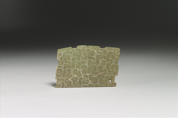 長方形玉片,邊緣有凹凸齒棱。單面琢以雲紋構成之龍紋,龍的五官不明顯,但間有斜線紋,或用以表達毛束。下面兩角鑽孔,上緣鑽三孔。背面有平行磨痕和一道深鋸痕。