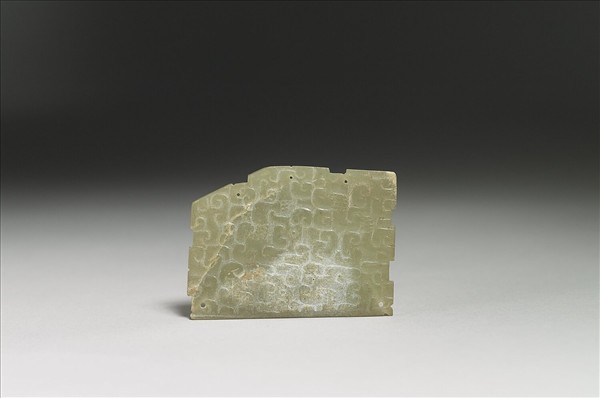 長方形玉片,玉有裂痕,局部有白斑。一角傷缺,邊緣有凹凸齒棱。單面琢以雲紋構成之龍紋,龍的五官不明顯,但間有斜線紋,或用以代表毛束。上緣三孔,下緣兩孔。背面有兩道斜向深鋸痕和平行磨痕。