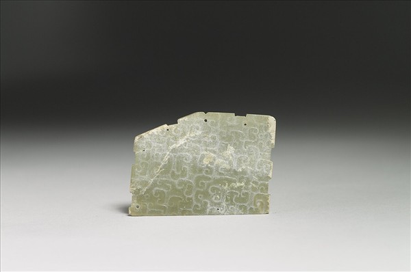 長方形玉片,玉有裂痕,大片沁作白色。一角傷缺,邊緣有凹凸齒棱。單面琢以雲紋構成之龍紋,龍的五官不明顯,但間有斜線紋,或用以表示毛束。上緣三孔,下緣兩孔。背面有道斜向深鋸痕和平行磨痕。