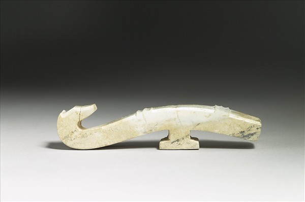 不透明白玉,夾雜赭黃色,有裂痕。細長條有弧度,一端向上內彎,背面中央突起一方形柱,用來鉤繫腰帶頭。鉤作龍形之抽象表現,面部凸雕兩組三條線紋。
