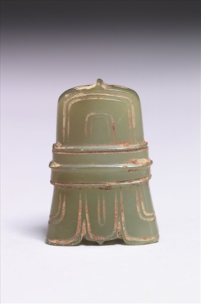 玉質,沾有硃砂。器扁,上窄下寬,中間凸雕三條環帶區隔,上端作「介」字結構;下端分三塊,中間塊也作「介」字結構。正面陰線刻線條;背面有四孔,分別鑽向側邊。