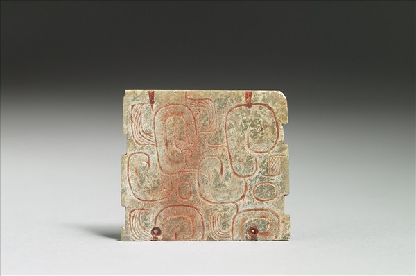 玉質,表面有刮痕及硃砂。左右緣有小凹。單面陰刻龍紋,結構幾何化,「L」形部分以平行線填滿,紋飾重覆出現。上下各鑽兩個小孔,孔外正面有凹槽。