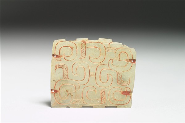 玉質,沾有硃砂。上下緣各有方形小凹和三角形缺,上緣有弧度,一角有傷缺。單面陰刻龍紋,結構幾何化,部分面積以平行線填滿,紋飾上下左右對稱。兩側各鑽兩個小孔,孔外正面有凹槽。