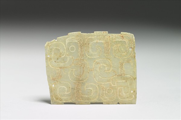 玉質,有裂痕。上下緣有小凹,一角有傷缺。單面陰刻龍紋,結構幾何化,部分面積以平行線填滿。兩側各鑽兩個小孔,背面有兩道凹槽。