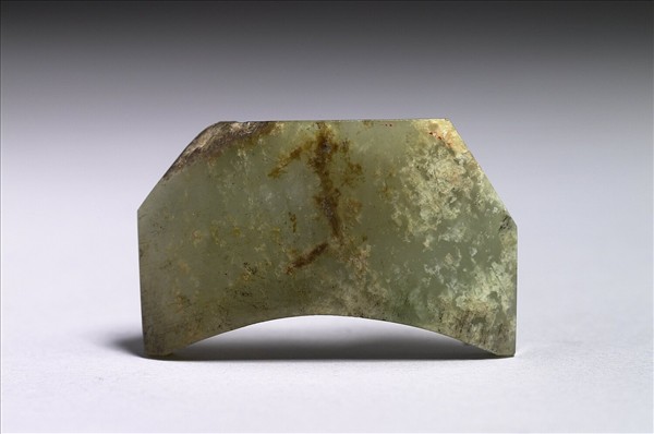 玉質,有白斑、赭斑、芝麻黑斑,表面帶有一些附著物。似玉璜的形狀,惟上方作梯形而非圓弧形,正反面皆為平面。全器無穿孔。