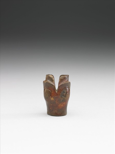 此件曾測試比重為2.55硬度為3.5,從比重硬度數據分析,可能是蛇紋石質。它雖非清宮舊藏,但可能經過盤摩或沁染,所以呈現溫潤的褐紅色。整體觀之,很像有立耳的獸龍頭部,但除了一雙雕重圈紋的大眼之外的器表,都刻畫圓轉的、方迴的旋紋,以及二、三條一束的平行短線。「獸龍」是史前流行於華東地區玉雕母題,琢成哺乳動物的胚胎模樣。